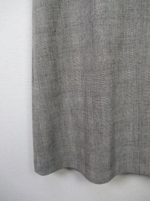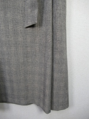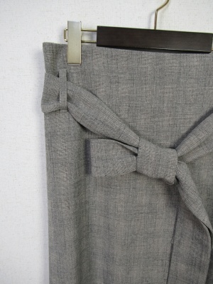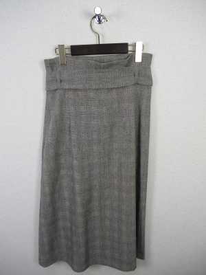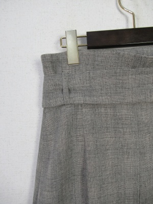 ハイウエスト 左の方に打ち合わせのタック有り そのためファスナーは無い ぺプラムのウエストラインに共のベルト付き 裾に向かってややAライン ミモレ丈 手洗い可能 細かいグレンチェックのようなチェック柄の地模様