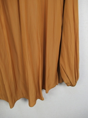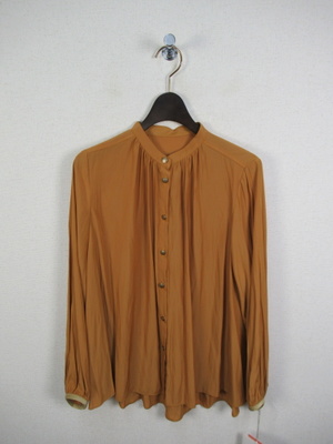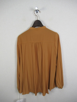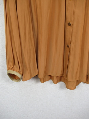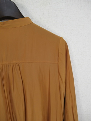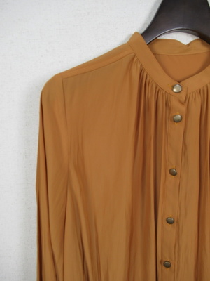 とろみのある生地、やや光沢もあります 襟なし 前開き ネックにギャザー 後ろ背のところで切替あり 袖口ギャザー 玉縁は同系色の異素材使用 やや裾に向かって広がりがある 後ろ長め 手洗い可能 ボタンは艶無しゴールド