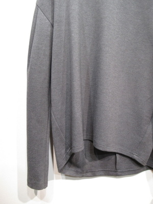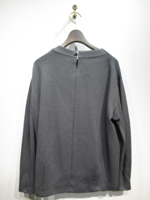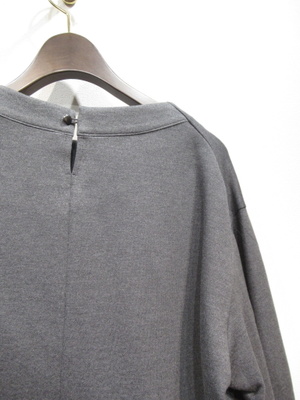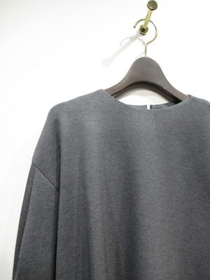 定番のアクリルレーヨンのカットソー ドロップショルダーで袖山タック入り 裾は前後差が有り フロントアーチ型 後ろの裾にタックが入りややコクーンシルエット ネック後ろゴールドのボタン 手洗い可能