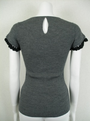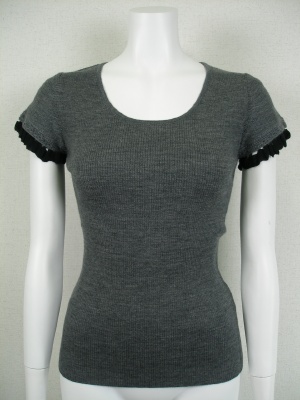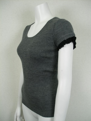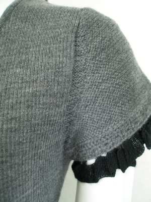 袖口にカギ針編みのフリルをつけたフェミニンなニット。身ごろはリブなので、スカートにインしやすいデザインです。