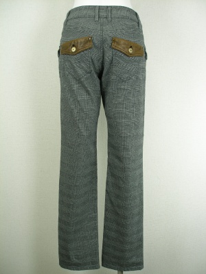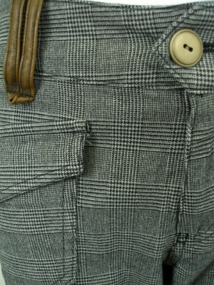 ライトグレーとチャコールグレーは細かい千鳥格子柄で、ミディアムグレーはグレンチェックです。ベルトループとポケットに合皮を使用。