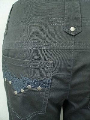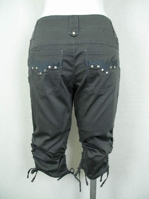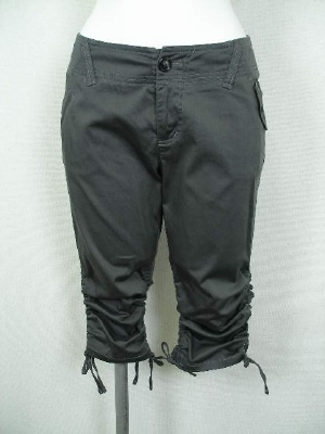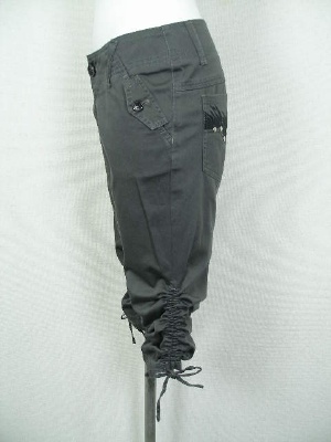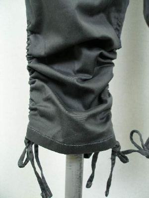 膝下ギャザーのカジュアルなストレッチパンツ。裾の紐でギャザーと長さを調節します。