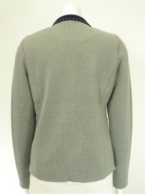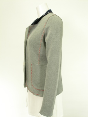 衿やポケットに違う色でアクセント。 さらにステッチに赤や白の糸でポイントをつけています。