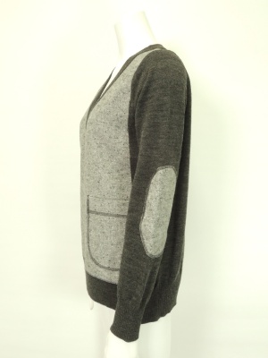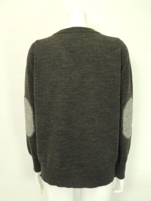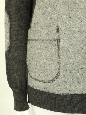 前身頃とエルボーパッチに異素材を使ったニット。