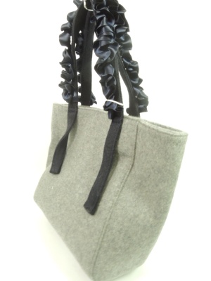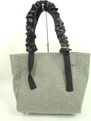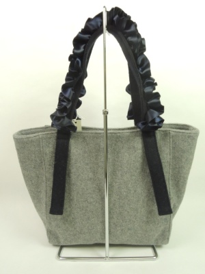 中布は白×ブルーの細いストライプ柄 その生地にポケットが付いてます。 持ち手のリボンはグレーがブルー、黒はチャコールグレー