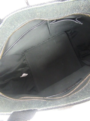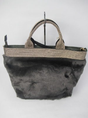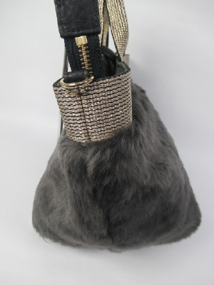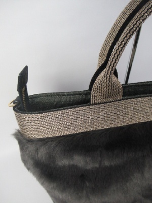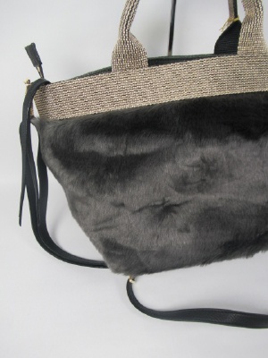 フェイクファー、持ち手あり(取り外し可能)マチは深め、シルバーゴールドのリボンテープ、天ファスナー