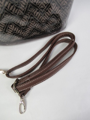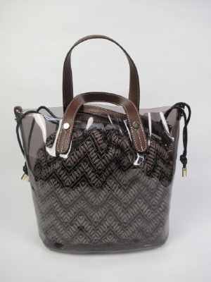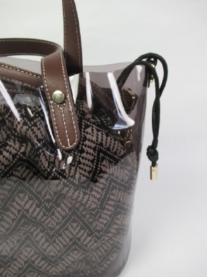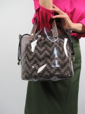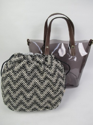 インバッグはゴブラン織りの巾着袋 外は透明な素材のバケツ型 中の巾着は同じ色 ショルダーベルト付き
