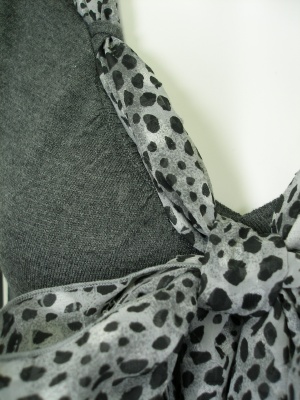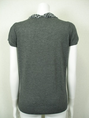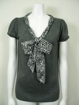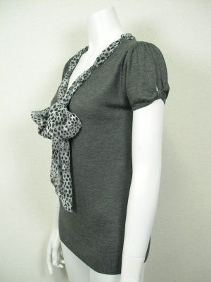 柔らかい素材のVネックニット。ネックラインのループにアニマル柄のスカーフ(ポリエステル)を通してあります。