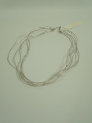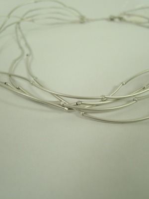 カーブしたパイプと小さなパーツを交互に組み合わせて動きを出したネックレスです。付け心地は軽く5連になっています。