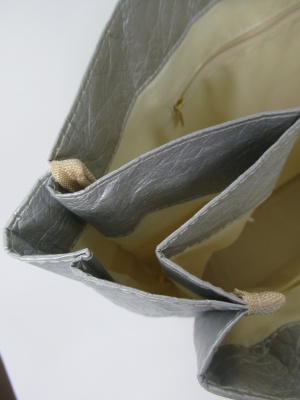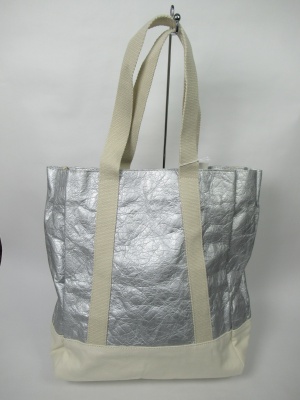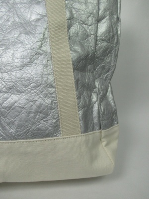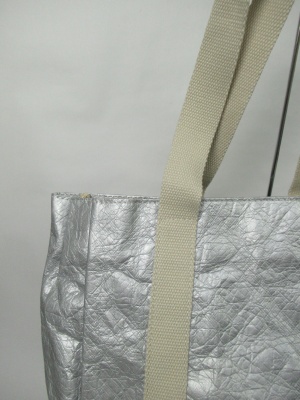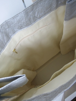 トートバッグ、両サイドはペットボトルなどを収納できるポケットあり、中にファスナーとポケット