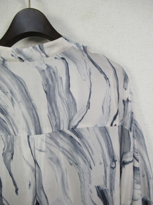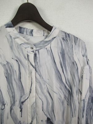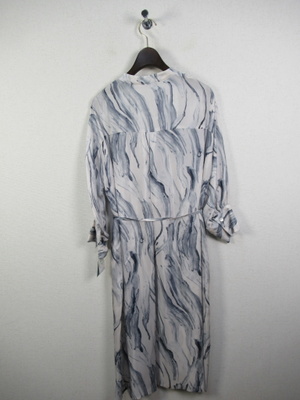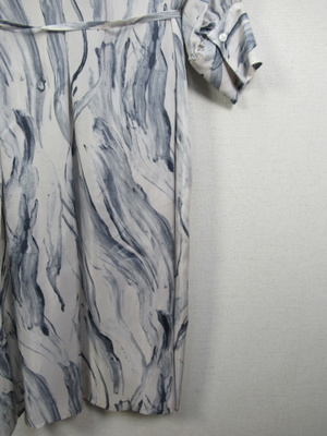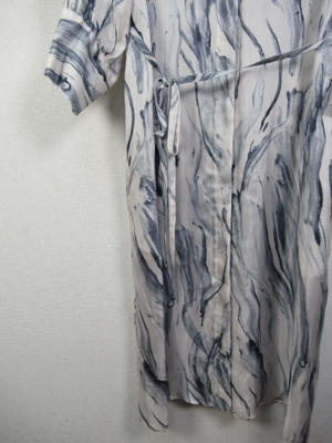 襟なし とろみのある生地 シャツワンピースのようなデザイン 前は下まで開く 比翼ボタン モアレ調の柄 ドロップショルダーでカフス 袖丈やや短め 共の生地でウエスト細いベルト 前を開けて羽織に羽織として着こなしもできる 手洗い可能