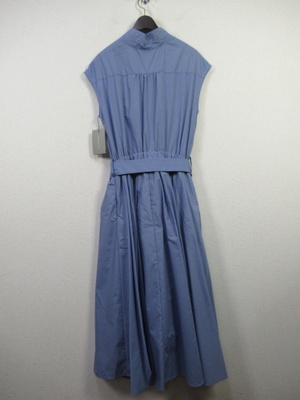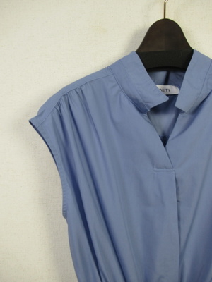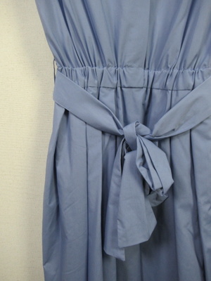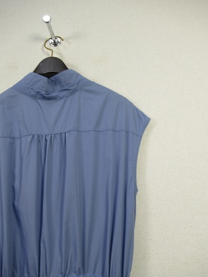 プルオーバーのシャツワンピース 襟はスタンド フレンチ袖 フロントスキッパー襟 ウエスト総ゴムギャザースカート スカート部分は裏地付き 共生地のリボン生地脇ポケット 手洗い可能