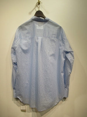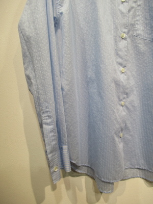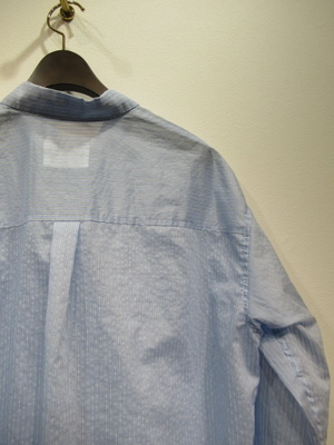 ストライプ柄のシャツ、ステンカラー、ドロップショルダー、身幅広め、前後差有り、手洗い可能