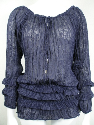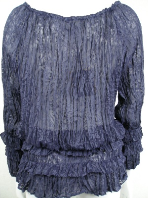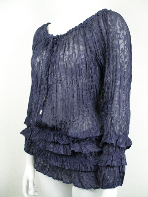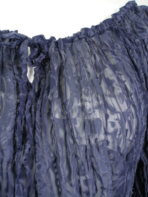 オパール加工の生地をさらにシワ加工して裾のあたりに段々をゴムでシャーリング加工。襟ぐりもヒモ調整できます
