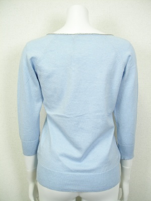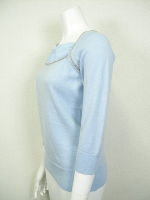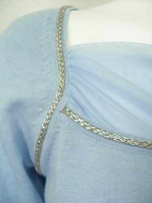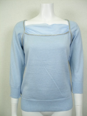 スクエアカットのニット、胸元のシフォン地がオシャレ度をアップ、トリミングにラメ糸を使ってよりシフォンを際立たせる