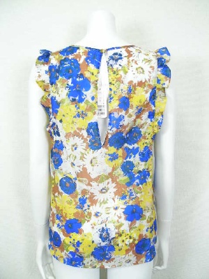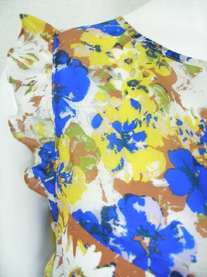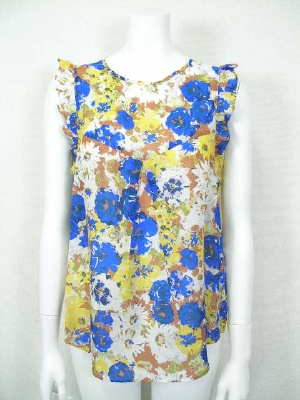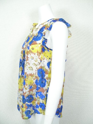 流行の水彩画風花柄プリントで、レトロな雰囲気のブラウスです。ややAラインで、裾はラウンドしています。肩のフリルがカワイイ!