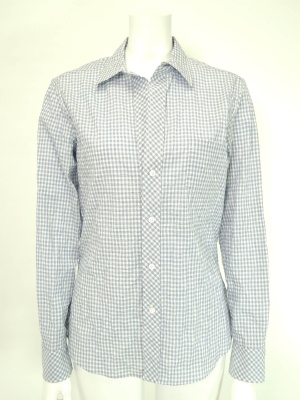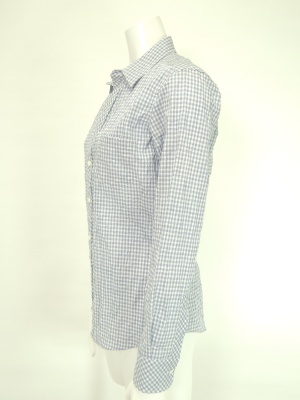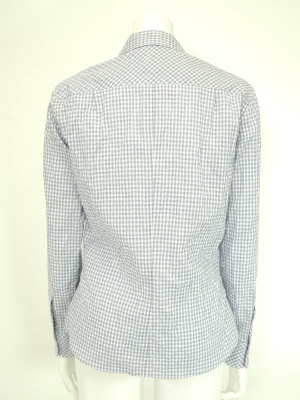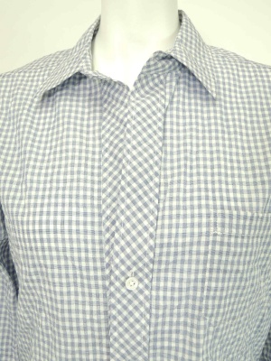 シワ加工で軽い素材感のチェックシャツ。上の方のボタンはなく、首元をスッキリ見せるデザインです。