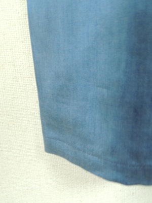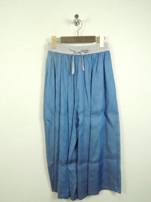 ダンガリー素材、ウェストシャーリングゴム、中央紐で調整できるようになっています、裏なし手洗い可能