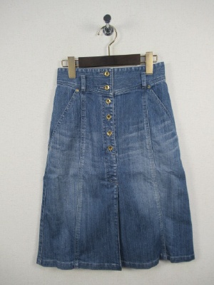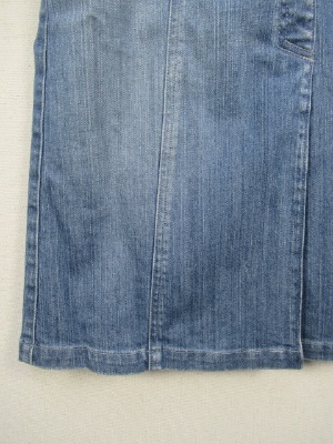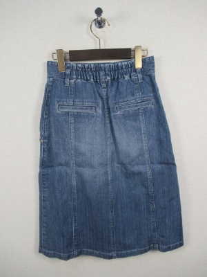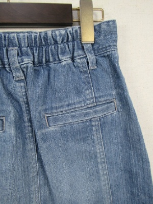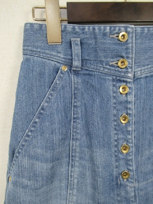 8枚ハギのAラインスカート、デニム地、フロントボタン、ウェスト後ろゴム、脇ポケット、前はスリットではなくタック