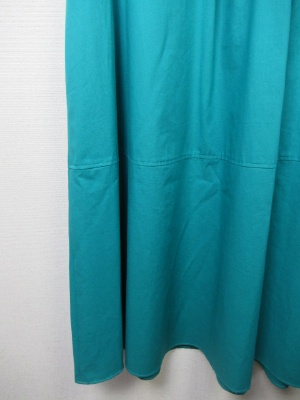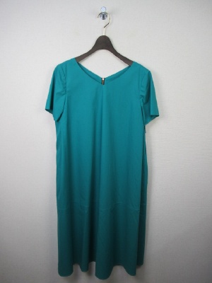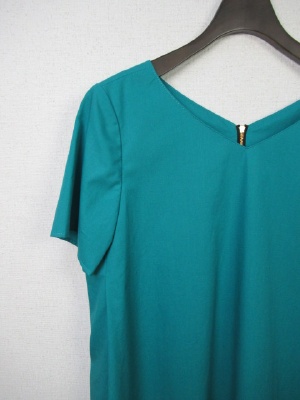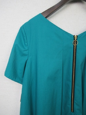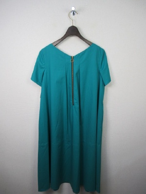 Vネック、後ろファスナー(ゴールド)で その両側にタック、脇ポケット、Aラインのシルエット、裏地あり、スカート部分に切り替えあり