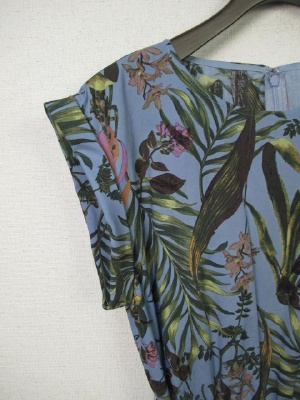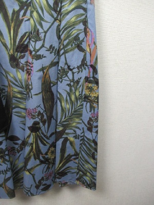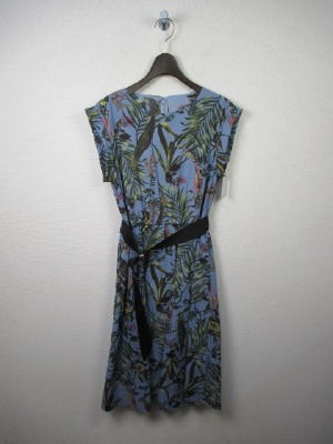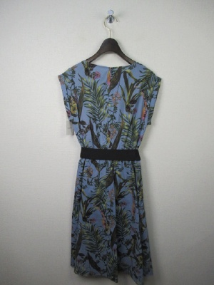 ボタニカル柄 ウエストゴムのワンピース ペチコート付き 後ろファスナーうえストに5cm幅のグログランテープベルト付き(黒) 手洗い可能