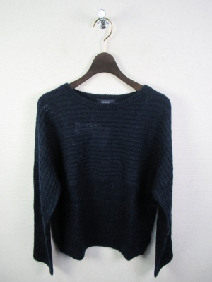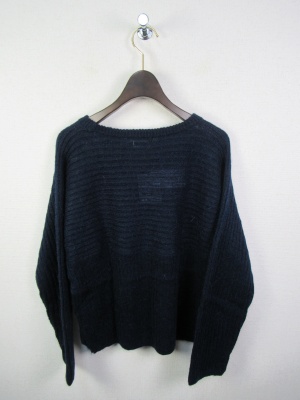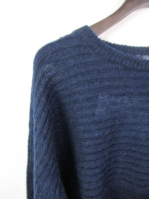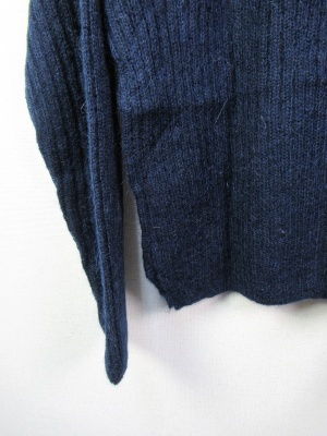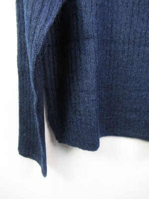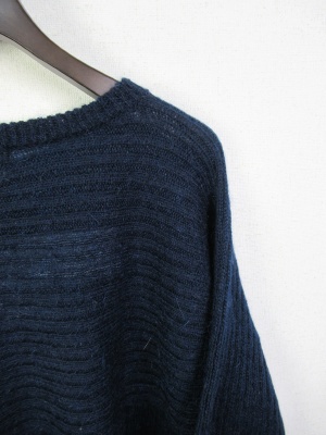 少し毛足の長い糸 編み地は畦編みを身ごろの中央で変えて上半身から袖は横 下半身は縦になる