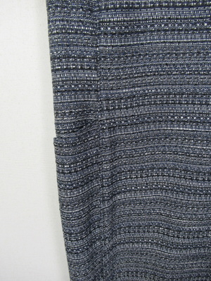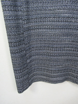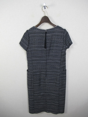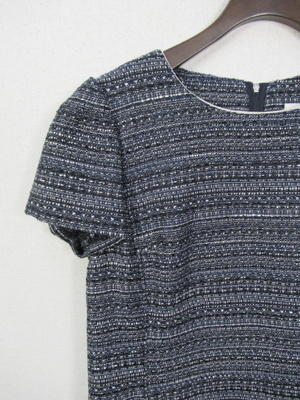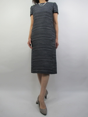 ツイード生地(シルバーのラメ糸が混ざってます)を使ったシンプルなデザインの半袖ワンピース 後ろファスナー 脇ポケット 裏地有り 後ろベントスリット 襟ぐりシルバーのトリミング