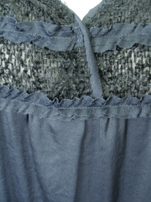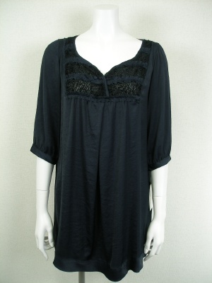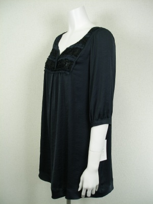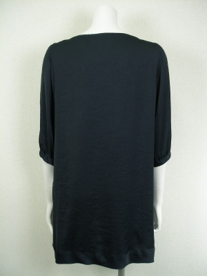 やや光沢のある薄い素材のチュニック。胸元は透けますので、重ね着をおすすめします。冬はインナーに長袖タートルを着ると可愛いですよ。