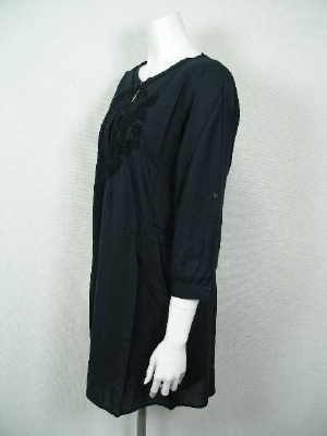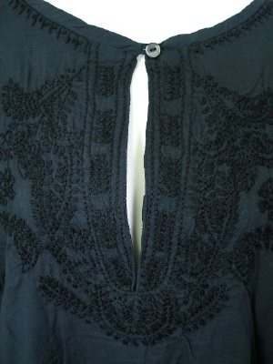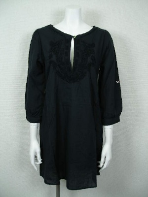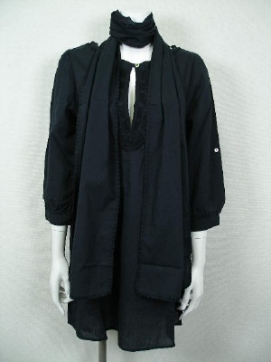 胸元に生地と同色の刺繍を入れたチュニックワンピース。共布のストール付き。素朴な風合いの綿素材です。裏地なし。カラー「ネイビー」は黒に近い紺色です。