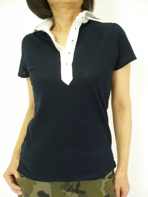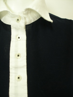 カノコのポロシャツで、衿と前立ては布帛(綿100%)です。