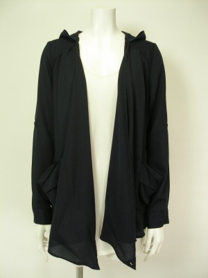 ドレープたっぷり、フード付きのアウター。
