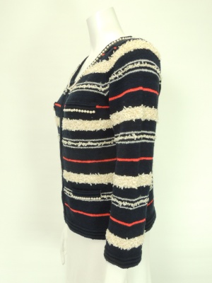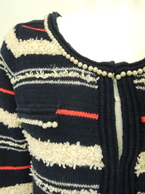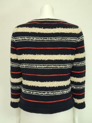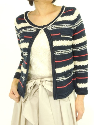 ネックラインとポケットのパールが上品なニットジャケット。