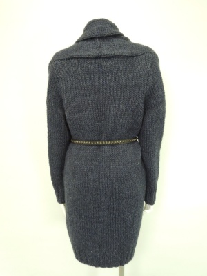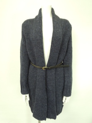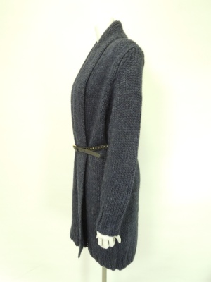 スタッズ付きの細ベルト(牛革)でウエストマークする、ローゲージのカーディガン。