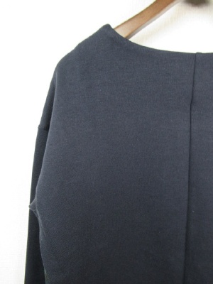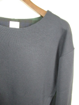 ややドロップショルダーで左部分にチェックの異素材、左脇部分から切り替えになっていて後ろ身ごろも少し別布が見えます