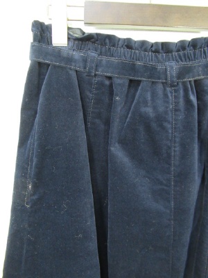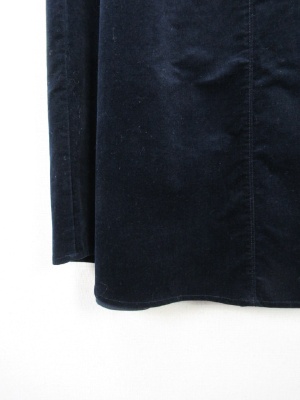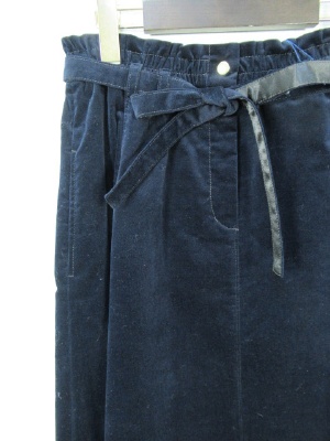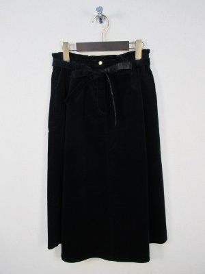 別珍素材ミモレ丈 フレアースカート 裾はラウンド型シルエット ウエストギャザーゴム 前ファスナー 共ベルト付き 裏地なし脇ポケット