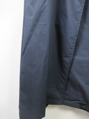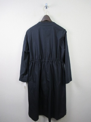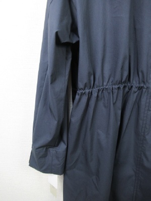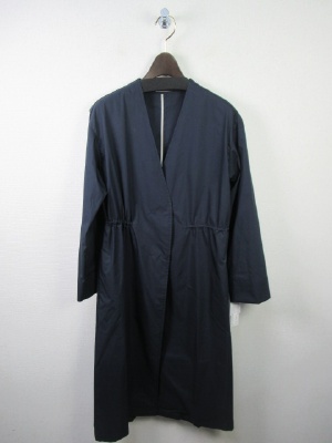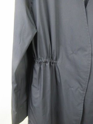 ノーカラーのスプリングコート、前ボタン2つ、ウェスト部分ゴムでギャザー(調節可能)やや前上がり、両横脇ポケット、袖口スリットで折り返し可能