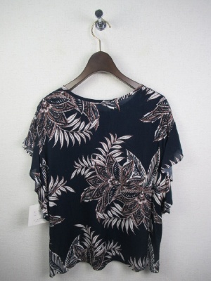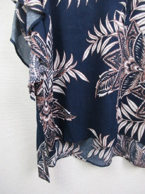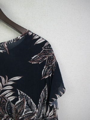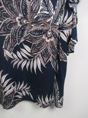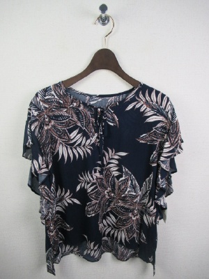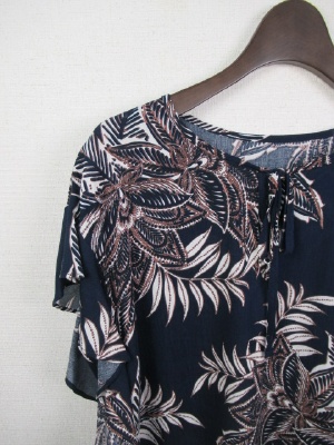 ボタニカル柄ブラウス、前リボンデザイン、ドロップショルダーでやや袖がフリル