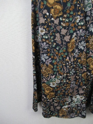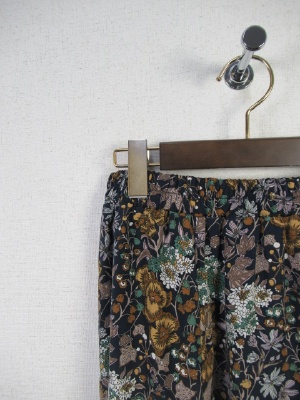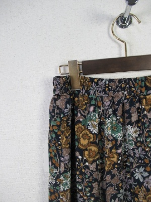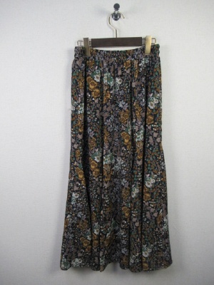 6枚ハギのスカート、ハギとハギの間に三角の生地を挟みこみ裾にかけてボリュームを持たせたフレアロングスカート、ウェスト総ゴム、裏地あり、手洗い可能、花柄