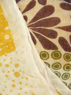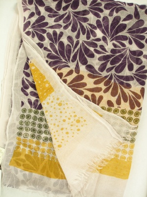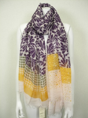 薄く軽い素材の大判ストール。リーフ柄とドット柄の組み合わせがオリエンタルな雰囲気。