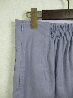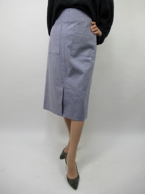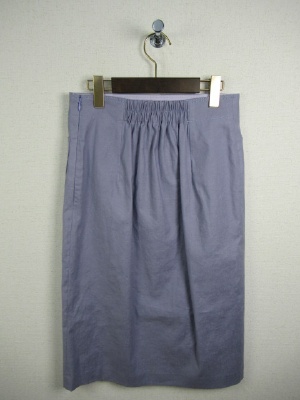ミモレ丈のベイカー風タイトスカート、横ファスナー、ウェスト後ろ中央がゴムでギャザーデザイン、前スリット、手洗い可能、裏地あり