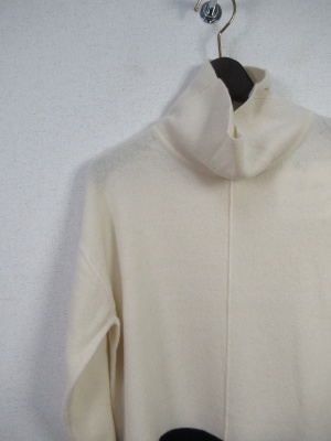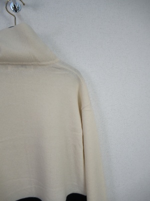 配色切り替えのニット、白は黄色とネイビー・グレーはネイビーとパープル・黒はグレーとブルー、スクエアデザイン、オフタートル、両横脇スリット