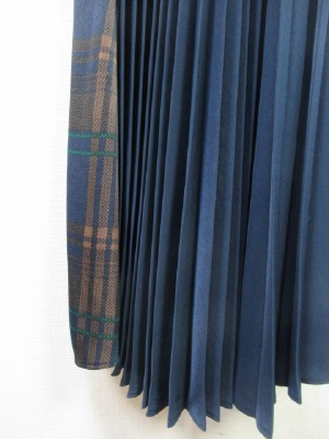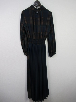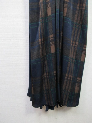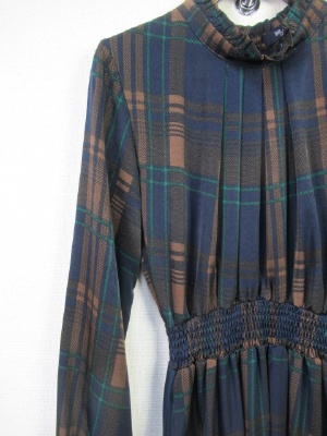 ロングワンピース 身ごろとスカート前部分チェック柄 スカートの後ろは無地の生地でプリーツ ウエストはシャーリングゴム 裏地なし