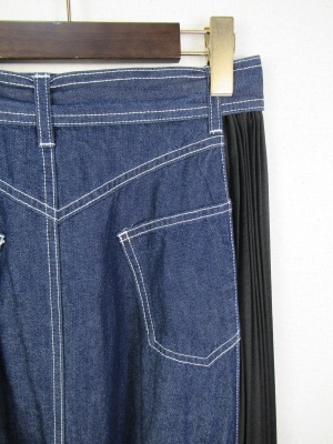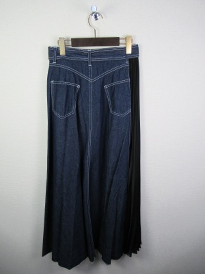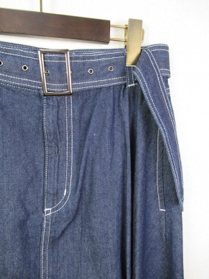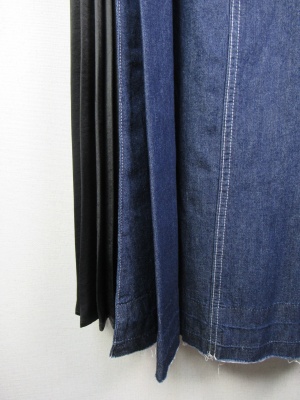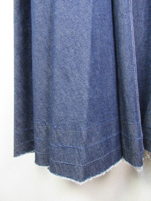 ダンガリーデニム地のフレア4枚ハギマキシロングスカート 裾は切りっぱなし(フリンジ) ウエスト共ベルト付き 右片方だけ別布(黒)プリーツをドッキング 裏地なし 前ファスナー ステッチは白