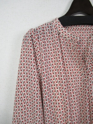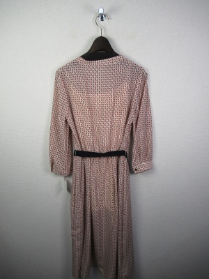細かい小紋柄 Vネック 袖七分 口はカフス ウエストギャザーゴム入り 黒のグログランテープのベルト ペチコート付き 手洗い可能