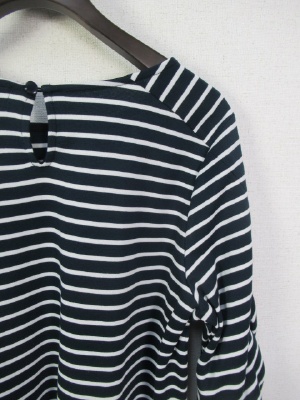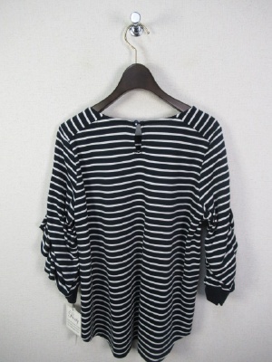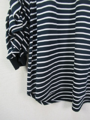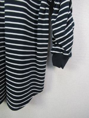 お袖がフリルデザイン、袖口がリブ、ID:100402は同じ形で無地、後ろボタン、裾はラウンドで前後差、七分袖、手洗い可能