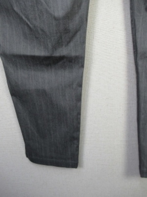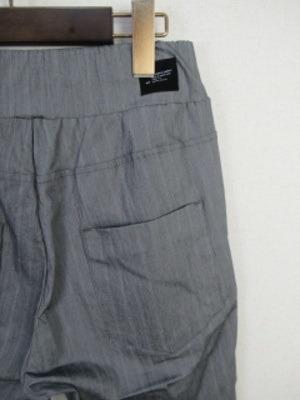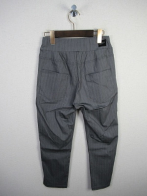 『晩夏初秋 新作』 うっすらストライプの地模様入り ウエスト平ゴム入りテーパードパンツ 脇ポケットとお尻部分も貼りポケット 足首は出る長さ 脇裾にスリットあり 裏なし 手洗い可能