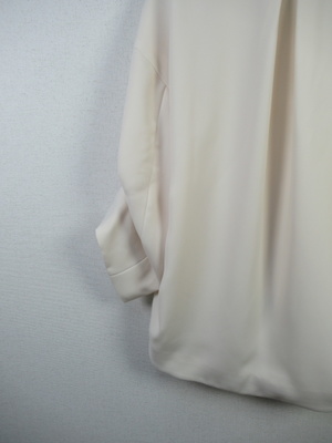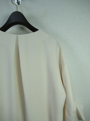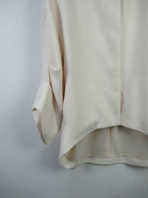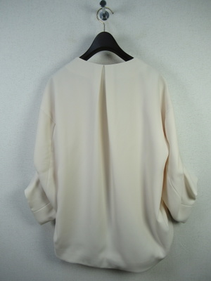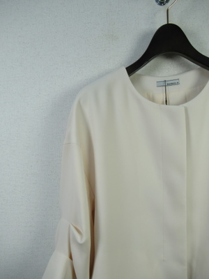 コクーン型後ろが長め襟なしジャケット ドロップショルダーで身幅広め 袖・・2段階でタック入 大きなホックで3箇所フロント留め 裏地有り