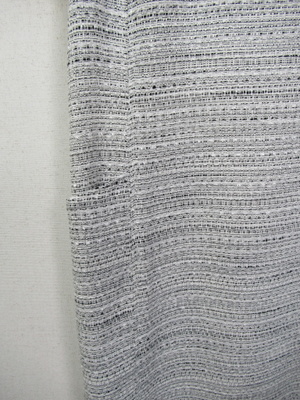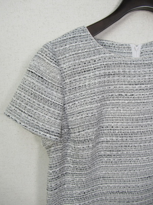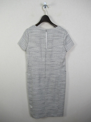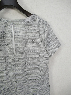 ツイード生地(シルバーのラメ糸が混ざってます)を使ったシンプルなデザインの半袖ワンピース 後ろファスナー 脇ポケット 裏地有り 後ろベントスリット 襟ぐりシルバーのトリミング
