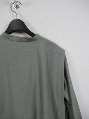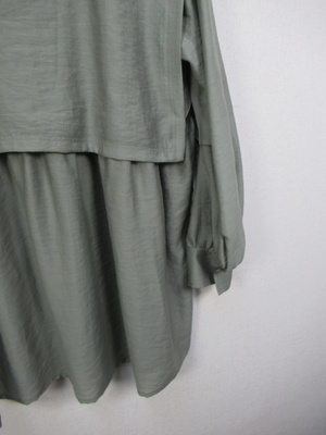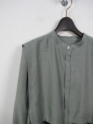 大きな襟のようなデザイン 2枚重ねで脇ボタンで前後をつないでます 光沢感有る生地が特徴 手洗い可能