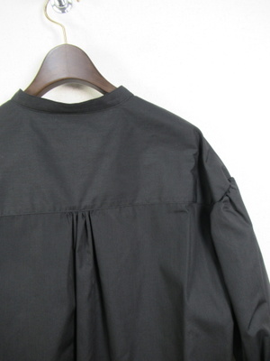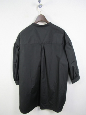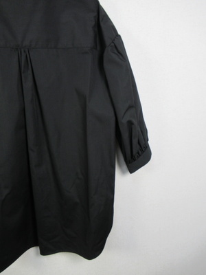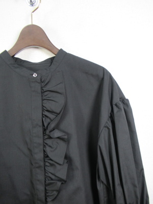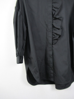 ハリの有るシャツ生地のブラウス 前立フリルが特徴 前は下まで開きます ドロップショルダー ボリュームあり 7分袖 裾後ろ長め 背のところタックギャザー 手洗い可能